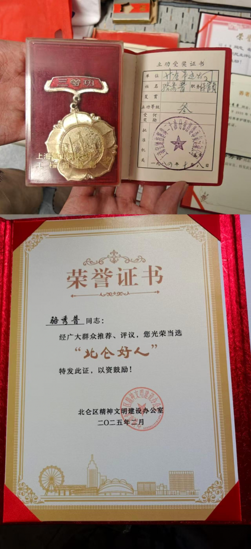 话音落下,骆秀普同志轻轻翻开珍藏的证书夹,泛黄的荣誉证书次第展开:“北仑好人”的烫金大字熠熠生辉,“叁等功”的鲜红印章庄严肃穆。这些凝结着岁月温度的证书,如同无声的诗行,将一位老党员半生的奉献与坚守,尽数铺展在芯青年们眼前。