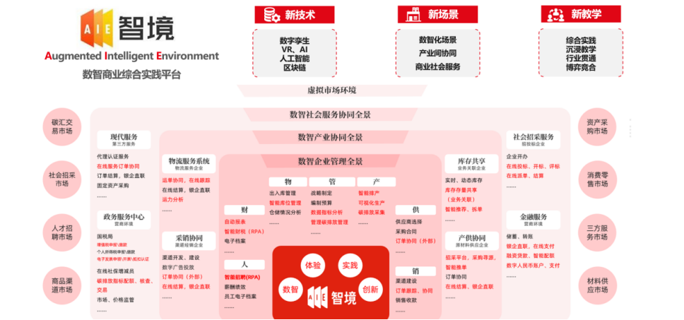 AIE智境—数字商科仿真模拟实训的开展是学校教育改革的一次重要尝试,也是实验教学改革的一次重要探索。AIE智境是新道科技推出的新一代数智商业综合实践教学平台。平台深度融合数字孪生、虚拟现实、大数据、人工智能等前沿技术,以开放性架构和丰富行业案例,支撑院校开设跨专业综合实践课程,致力于培养精通商业运作、掌握数字技术的复合型数智人才,助力教育数字化战略行动落地与产业升级人才需求对接。