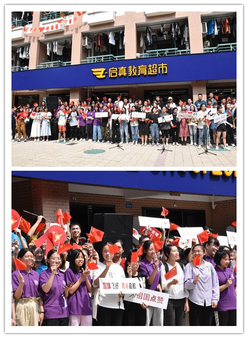 伴随着《我和我的祖国》、《红旗飘飘》、《没有共产党就没有新中国》、《东方之珠》、《唱支山歌给党听》等一首首脍炙人口的爱国爱党歌曲,过往师生纷纷自发驻足伴唱,手持小国旗,并贴上了“飘扬的五星红旗”,宿舍22幢楼上的同学们也自发来当阳台齐声高歌,几曲唱罢,动听的歌声飘荡在空中,深深爱国情感染着每一位参与的师生。70年光阴转瞬即逝,今天,富有朝气的宁理学子站在时间节点上,将以更加饱满的热情,不忘初心,砥砺前进,弘扬时代正能量,唱响主旋律,励志实现中国梦!