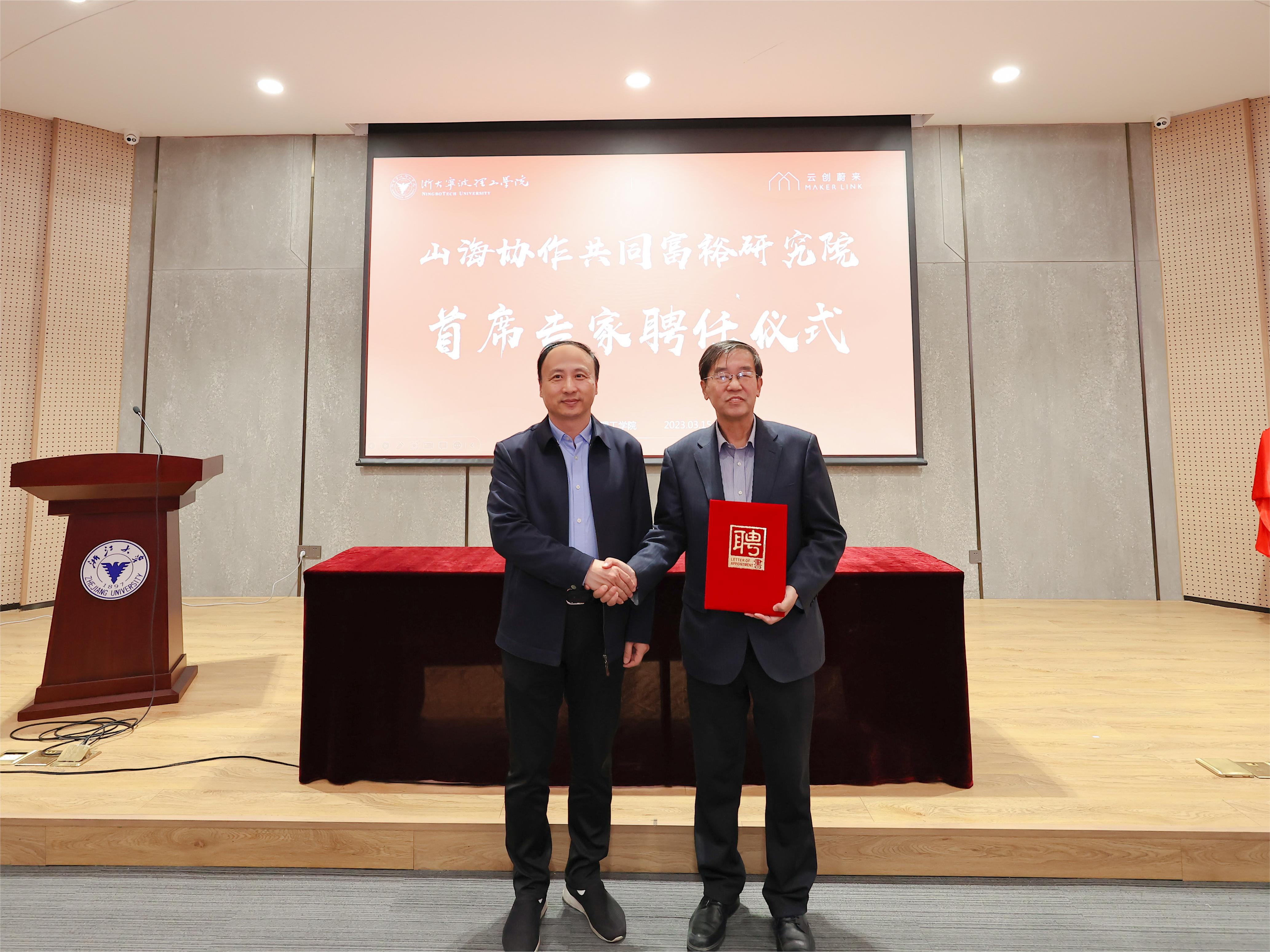 随后,胡征宇、冯建波宣读研究院院长、副院长名单并颁发聘书,聘任学校商学院院长、教育部青年长江学者苗青教授为院长,聘任商学院副院长刘艳彬教授为执行院长,商学院培训中心主任刘世峰和浙江云创浙理科技副总经理杜君成为副院长。聘任著名经济学家、浙江大学文科资深教授、浙江大学共享与发展研究院院长李实教授为研究院首席专家。