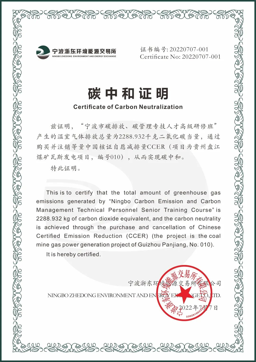 本次培训通过购买并注销等量的国家核证自愿减排量CCER(项目为贵州盘江煤矿瓦斯发电项目,编号为010),从而实现培训碳中和。