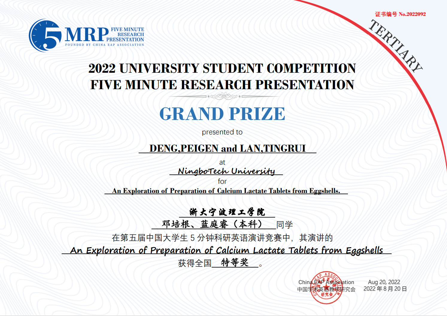 对于在比赛中获得特等奖,邓培根同学直言收获颇丰:“这次参赛除了锻炼了我们的学术英语演讲能力,还锻炼了与组员、老师之间的沟通能力、自己去发现问题并解决问题等能力。比赛内容选题与我曾经参加的科研项目有关,项目由周先波老师带领,感谢她当初一步一步带着我们完成项目。本次参加科研英语演讲能获得好成绩,离不开外语学院王欢老师的鼓励、督促和指导,还有王丽芳老师提供的各种帮助。也感谢我的搭档蓝庭睿同学和我一起对演讲内容和技巧反复打磨。备赛过程中,我还接触到了我们学校很多优秀的、有能力的同学。我想说,这类比赛能很好地提升我们的综合能力,从专业研究能力到学术英语语言能力,从舞台表现力到心理素质。希望今后能有更多的同学踊跃报名此类比赛,这不仅是一个为校争光的机会,还是一个磨练自己、使自己成长的契机。”