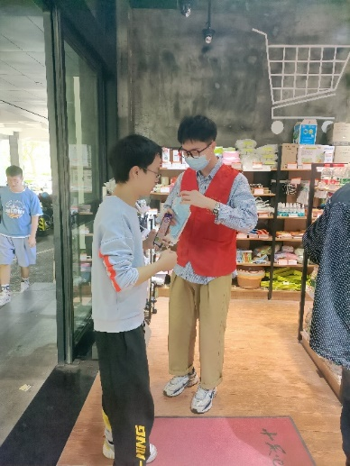 在此期间,志愿者们化身为疫情防控监督员,在校内各个超市门口,热心地为来往消费者测体温,呼吁师生们自觉佩戴口罩,提醒同学们不能松懈疫情防护,为校内师生的疫情防控贡献力量。