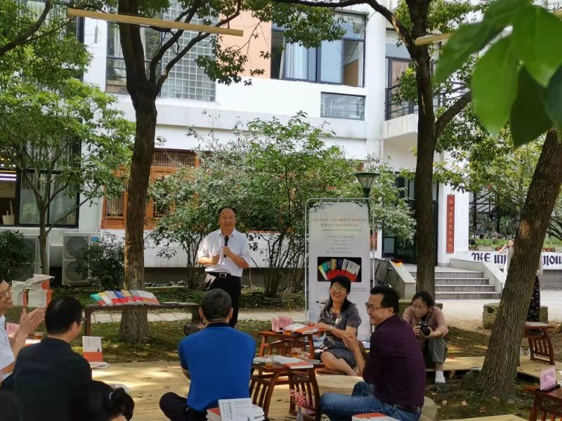 随园论道的第二阶段是学者讲学,此次活动邀请宁波大学教授兼宁波文化研究会会长张如安讲话,张教授表示他在树下讲学尚是第一次,并称赞这次的新书发布会及传统文化研讨会的形式和板块。讲话最后他更是为大家吟唱了辛弃疾的词作;土建学院范俊杰教授以“木下之交”,阐述了它的含义,重现古代讲学,过往行人与树下之人交流和分享;传媒学院教授兼宁波文化研究会副会长的陈雪军老师,从自己与阳明的渊源与学脉谈起,认为阳明思想不仅仅只是人们口中的“知行合一”、“致良知”,而且更有“求是”精神;浙江省社科院副研究院研究员兼浙江国际阳明学研究中心秘书长张宏敏在发言中提出人人心中有阳明,他分享去广西阳明洞探索的经历,告诉我们行事应怀揣一颗诚心;余姚市历史文化名城研究会副会长谢建龙讲述了自己祖族与王明阳的“密切”关系,还给大家带来了正宗而柔软的余姚姚剧。《天一文苑》主编黄文杰认为这次活动提高了大学生课外活动的深度和广度,并赞赏了其对传统文化的意义。商学院副教授余志伟老师也表达了“用声音叙事”系列活动给大学生社会实践的重要意义。