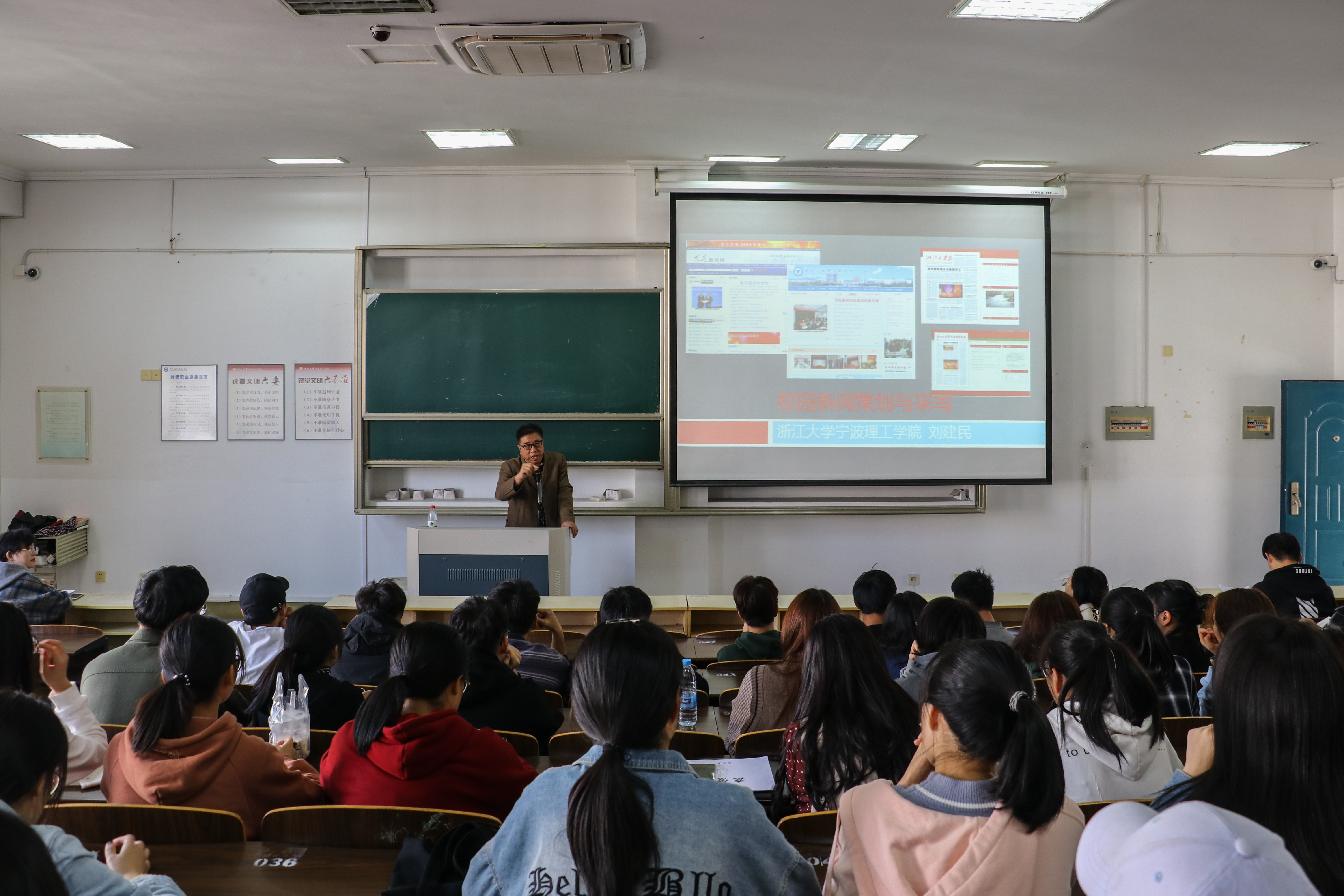 团课伊始,传媒学院辅导员董亚钊简短阐述课程安排的背景与意义,董老师指出11月8日也正是中国记者节,两个学院聚焦学生宣传工作的思想引领,以团课铸魂育人。随后,在热烈的掌声中,刘建民教授给同学们带来《校园新闻策划与采写》一课。刘老师依据自身丰富的理论基础和实践经验,着重为同学们讲解了新闻写作和新闻摄影知识;同时通过实际案例为大家分析新闻策划的采编要求,详细解读新闻点,并围绕“如何结合热点事件”与同学们展开讨论。刘老师还详细介绍了新闻最基本的要素,并指出应提炼出有意义、有价值的新闻要素;通过倒金字塔结构去构造新闻框架、角度分析、深化新闻主题。最后,刘老师希望同学们能用自己的角度去剖析,将最新、最真实的新闻呈现给大家。