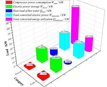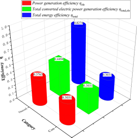 系统包含太阳能光伏发电子系统、集热子系统、制冷子系统,原理如图2。系统通过采用光谱分频技术将高频光谱(380-1200nm)输送至光伏发电子系统以产生电能,电能可用于供给制冷子系统、供热子系统用电设备的电量需求,多余电量可存储于电池。同时,光伏子系统采用冷却水回收部分热能、确保光伏组件工作温度处于最大工作效率。光谱分频后的低频光谱用于集热子系统回收热量以加热载热介质,热流体主要用于驱动喷射式制冷系统和供应用户热水/采暖等热负荷需求。在制冷子系统中,太阳能热量主动转化为冷量以有效提升能量品位,喷射/压缩复合式制冷子系统虽消耗部分光伏电量,但可实现更宽温度范围的高效制冷,突破了常规压缩式制冷性能提升困难的技术瓶颈,实现在满足用户冷量、热量、电力供应需求的条件下,获得更高系统性能并提高太阳能综合利用率。性能分析如图3和图4,通过分析得知,新型系统的能量总利用效率和综合发电效率分别可达82.7%和44.9%,较传统光伏系统性能提高显著。新系统为提高可再生能源利用效率提供了新的思路,也为实现“双碳”目标发挥积极的促进作用。