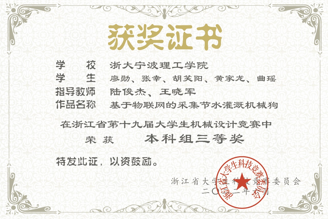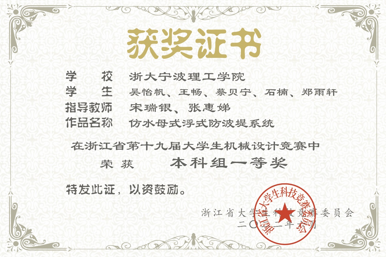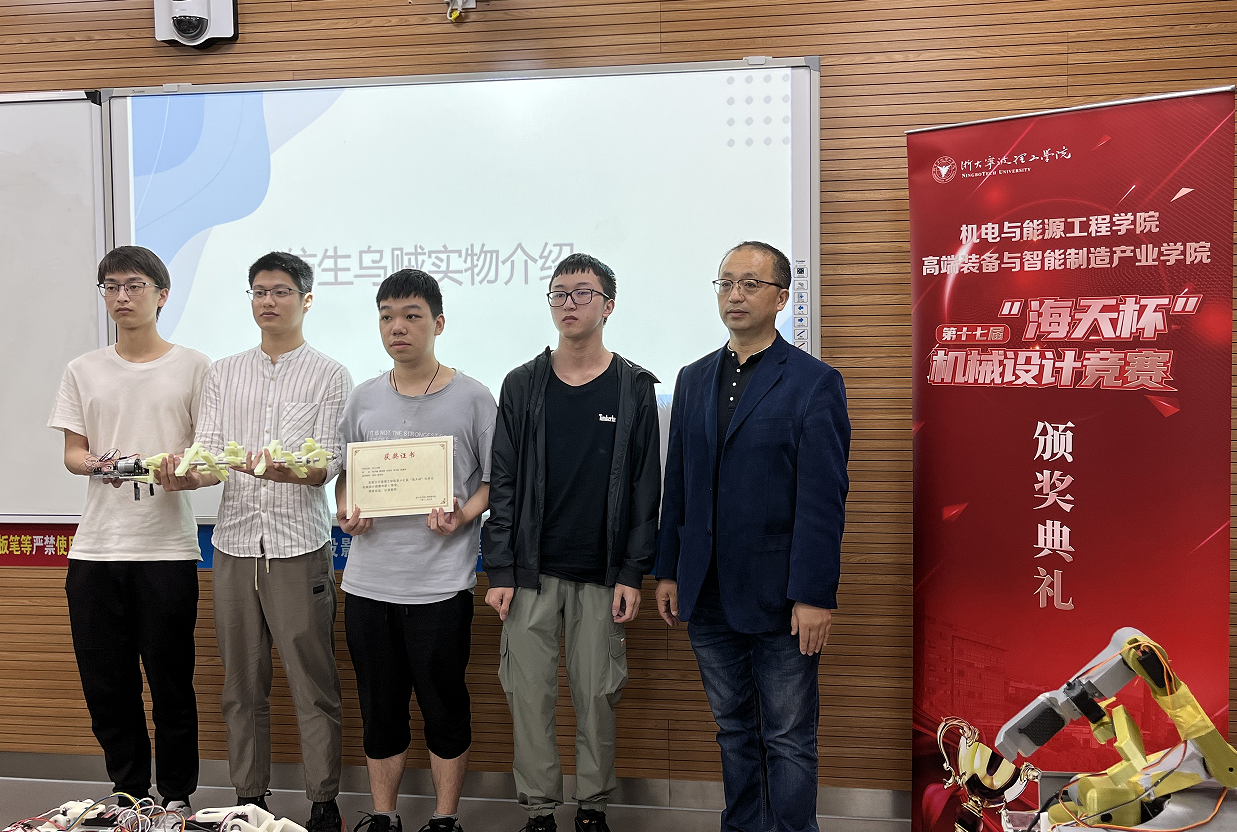 近日,由浙江省大学生科技竞赛组委会主办的2022年浙江省第十九届大学生机械设计竞赛决赛如期举行。本次竞赛主题为“自然•和谐”,竞赛作品分仿生机械与生态修复机械两个方向,全省共46所高校377支队伍参赛。经过理论初评和线上答辩,我校推荐了7个作品参与了决赛,获一、二、三等奖各1项。