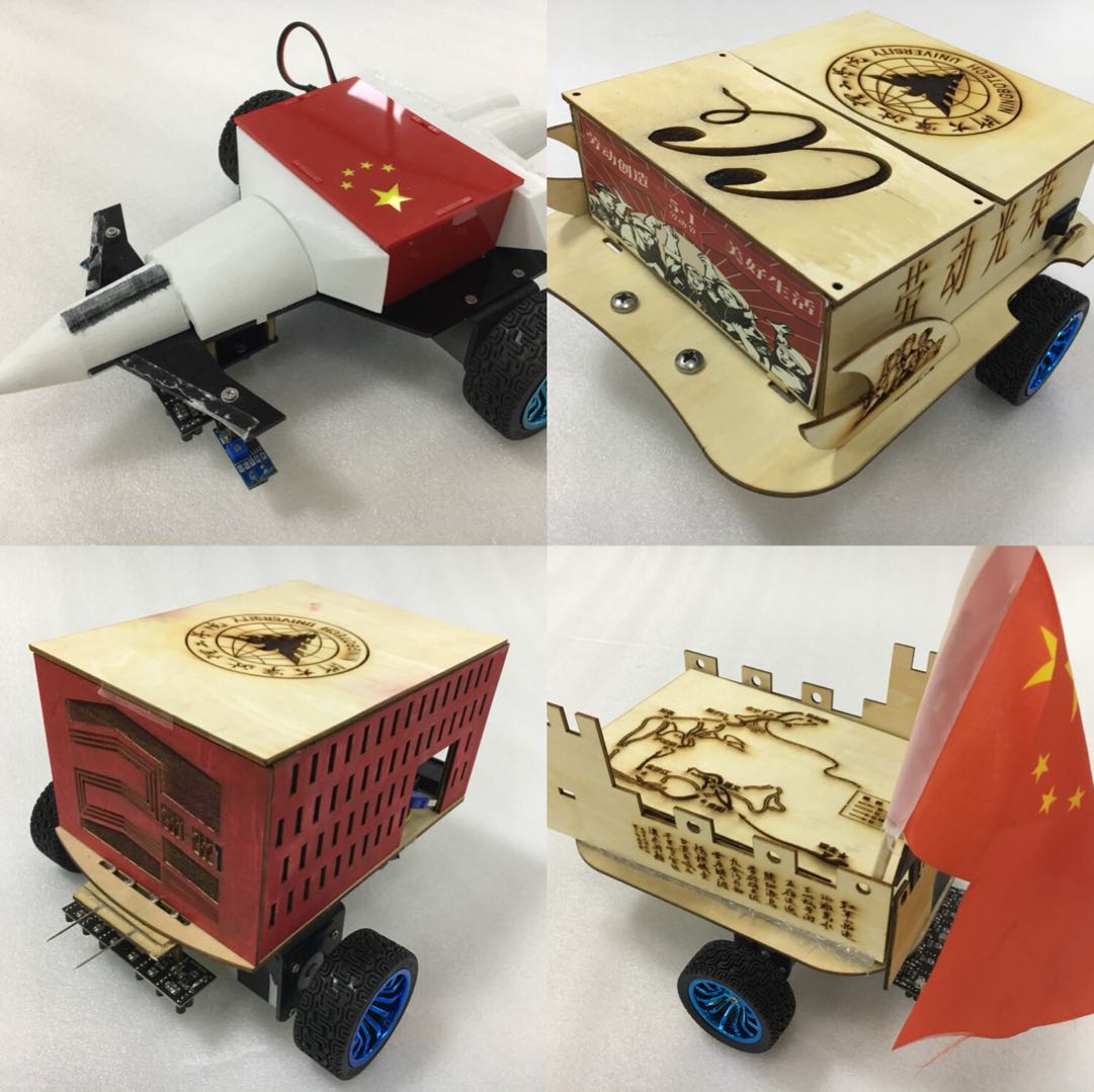 关于来自NIO队团队的“歼二十”小车,队长倪天然同学介绍到,他们的设计灵感是来源于通过查阅资料学习党史,了解到在新中国成立后,中国空军尚处于落后水平,为了大力发展空军力量,中国科技人才们不畏艰险,不惜一切,克服重重困难终于造出了世界一流的第五代战斗机--歼-20战机,彻底结束了中国在空军力量领域受制于人的时代。为了继承和发扬先辈们坚定的革命信念,不畏险阻的长征精神,团队成员以歼二十为原型设计制造了智能小车。这辆小车象征着红军战士一样的精神,不论道路有多曲折,都能到达终点。还有来自ZING队的“红船号”小车,队长席子杉同学介绍到,他们小车的设计理念来源于红船精神,小车设计成“红船”造型,船的底部画有波浪,代表乘风破浪、坚定理想、百折不挠的奋斗精神;在两侧用激光技术画上红船航行,代表扬帆起航,争做时代弄潮儿,小车上面是屋顶造型,代表可靠担当,我们当代大学生将勇于担当历史使命,继承开天辟地、敢为人先的红船精神。还有代码敲不队的“遵义号”小车,队长宋佳欣同学介绍到,小车以长征精神为主题取名为“遵义号”,其外观设计以长城形象作为主要载体,寓意长征精神同万里长城一般历经千年风霜依然能屹立不倒,小车的盖板用激光技术刻画出红军长征的行军路线,侧面刻以毛主席的七律长征,展现了红军长征不畏艰难险阻的拼搏精神,小车前方的五星红旗在行进中劈风斩浪扬帆起航。
