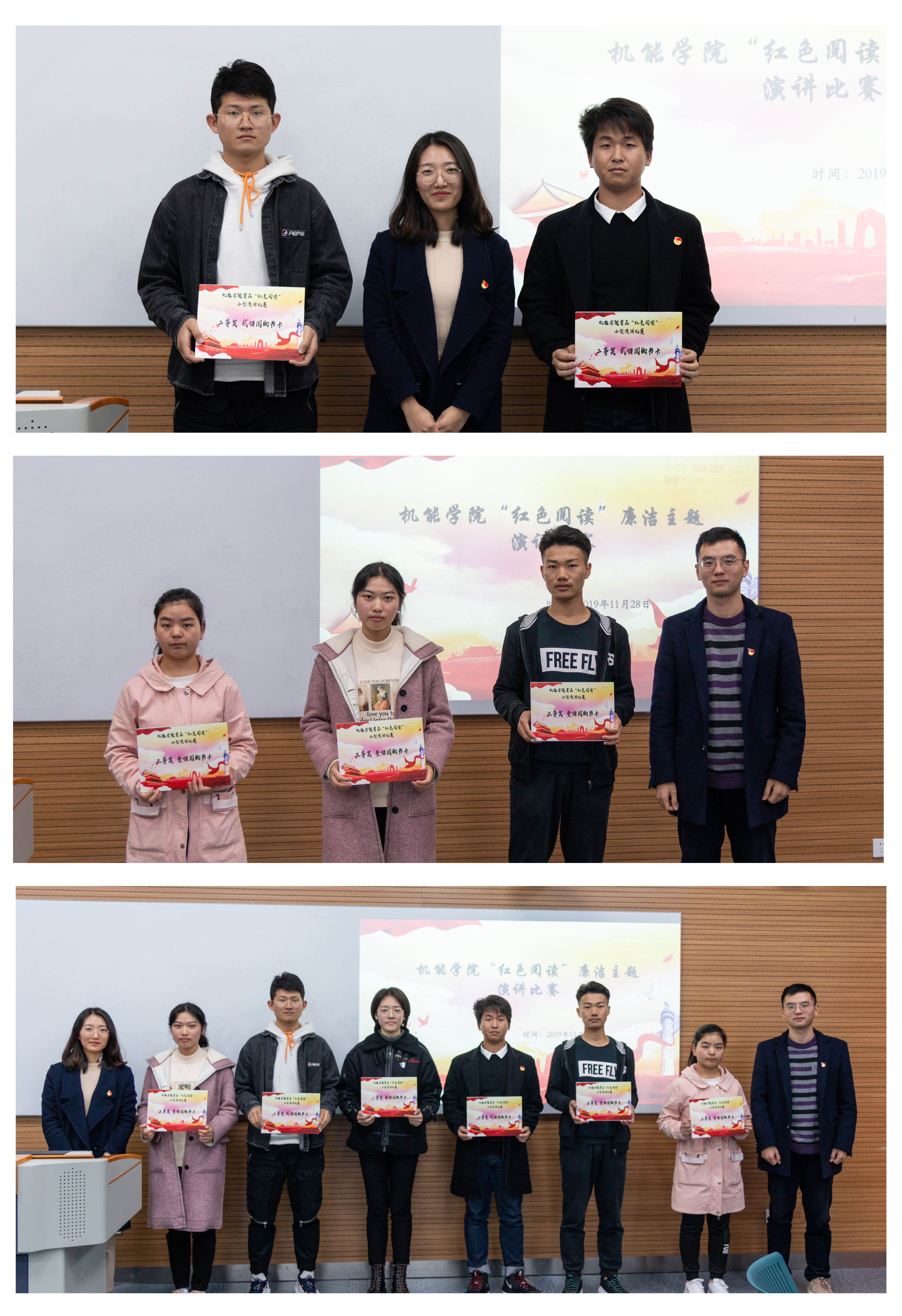 为培养大学生的正确价值观和高尚的道德情操,弘扬廉政文化,培养大学生的廉政理念,建设“清廉理工”,结合学校“廉政文化节”活动,11月28日晚,机能学院在NB103举行“红色阅读”廉洁主题演讲比赛。机能学院辅导员曹燕老师、兼职辅导员吴烨卿老师出席并担任评委,学院各学生党支部代表、2019级各班代表参与本次活动。