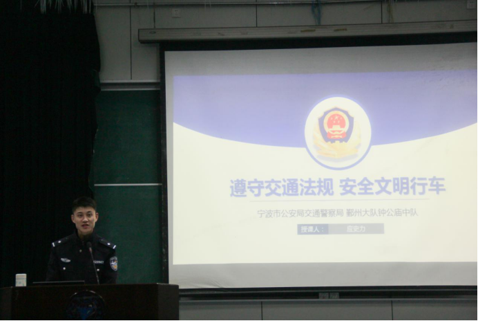 为进一步深化平安校园建设,提高安全教育实效,增强全校师生的安全意识,营造良好的教书育人环境,学校开展第八届“让安全成为一种习惯”校园安全月活动。11月14日下午18:30,交通安全知识讲座暨校内电动自行车号牌发放仪式在NF103举行,此次活动由保卫处主办、机能学院、法政学院承办。出席活动的是宁波市公安局鄞州分局交警大队钟公庙中队的邱指导和应警官、保卫处副处长叶卫树老师,机能学院团学干部、全体新生、法政学院同学和各学院学生代表参加,机能学院辅导员曹燕老师主持此次活动。