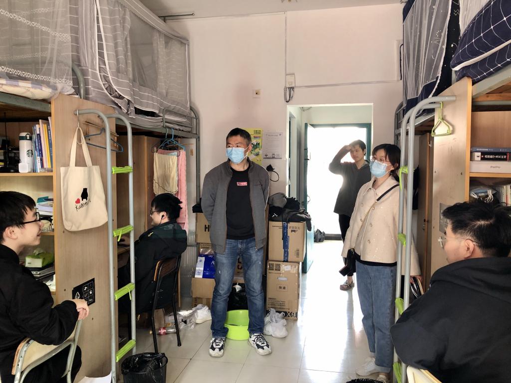 为了解公寓网格疫情管理分管楼幢工作落实情况,了解分管楼幢情况,与学生建立信任与联系,4月20日,学院党委副书记郑毅、全体辅导员等共同走访了25、26幢学生宿舍。