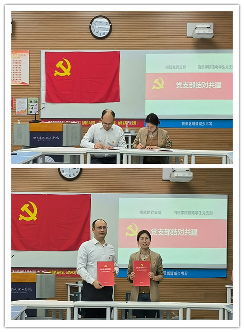 会上,招就处党支部书记郑剑老师介绍了支部的情况,表示希望共建共同推进基层党支部建设。信息学院党委副书记郑毅强调通过支部结对共建,加深支部间联系、资源共享,共同促进人才培养。信电学生党支部书记董俊娜简单介绍了支部的情况,双方党支部签订了支部结对共建的合作协议,并就今后党建工作开展,合力共推基层党建工作水平提升,共享党建资源,共同推进党建质量提升达成共识。