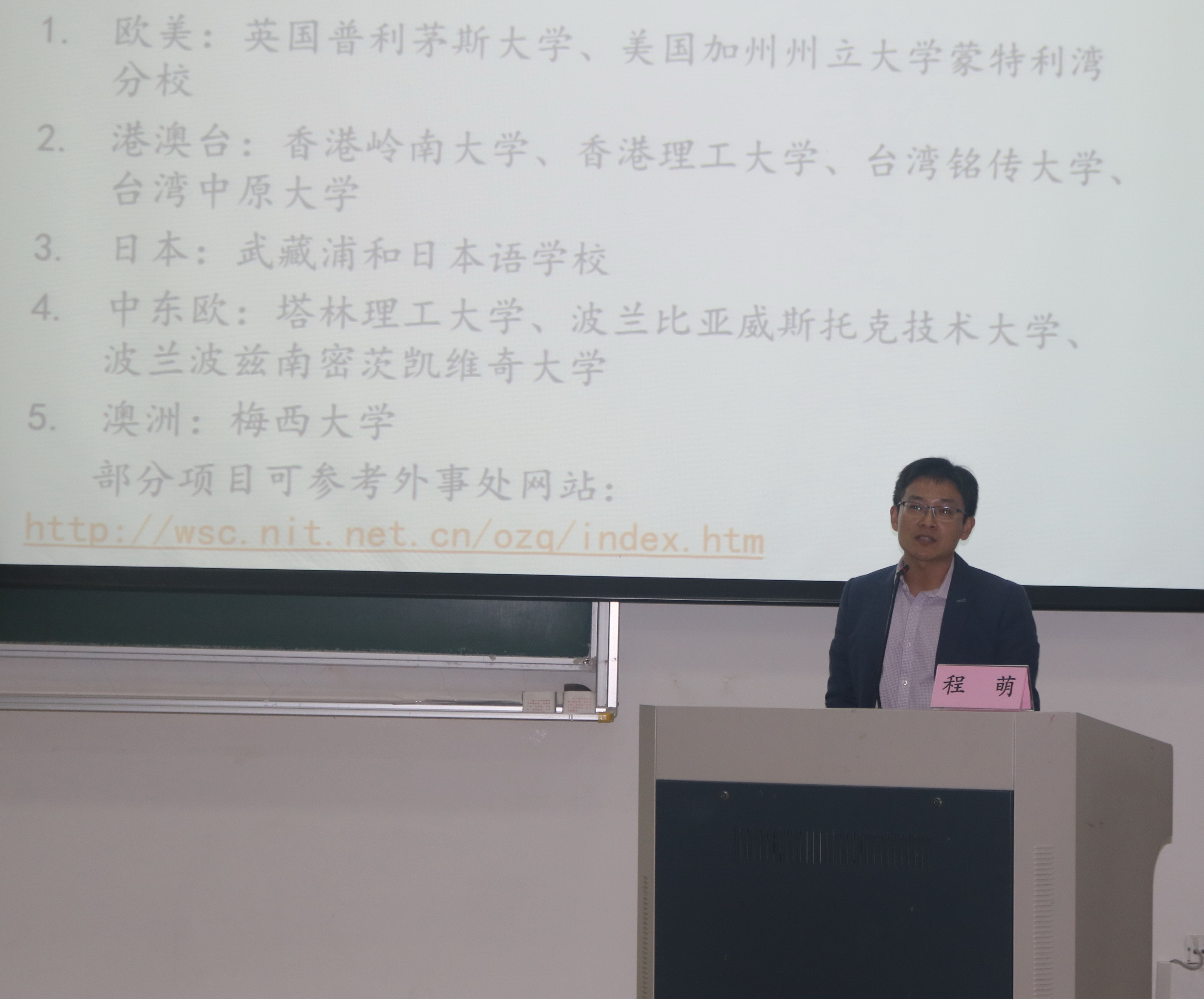 首先,程萌副处长从项目类型、合作院校、各类政策、签证办理以及在外注意事项等方面对学生出国境交流做了细致入微的介绍说明。他指出:“要有世界观,先要观世界。国际化是学生们提升自我、发展自我的重要环节,同学们如果想要参与国际交流,需及早规划并持之以恒去努力”。