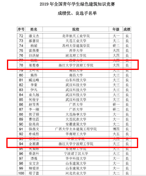 2019年6月28日,中国城市科学研究会绿色建筑与节能专业委员会以网络答题的形式,在全国范围内开展了大学生、高中生绿色建筑知识竞赛活动。此次活动共吸引了来自全国各地的117所高等院校和2所中学的在校生参与。学校有两名同学取得良好成绩,分别是建筑15级郑楚睿和道桥16级金展潇。
