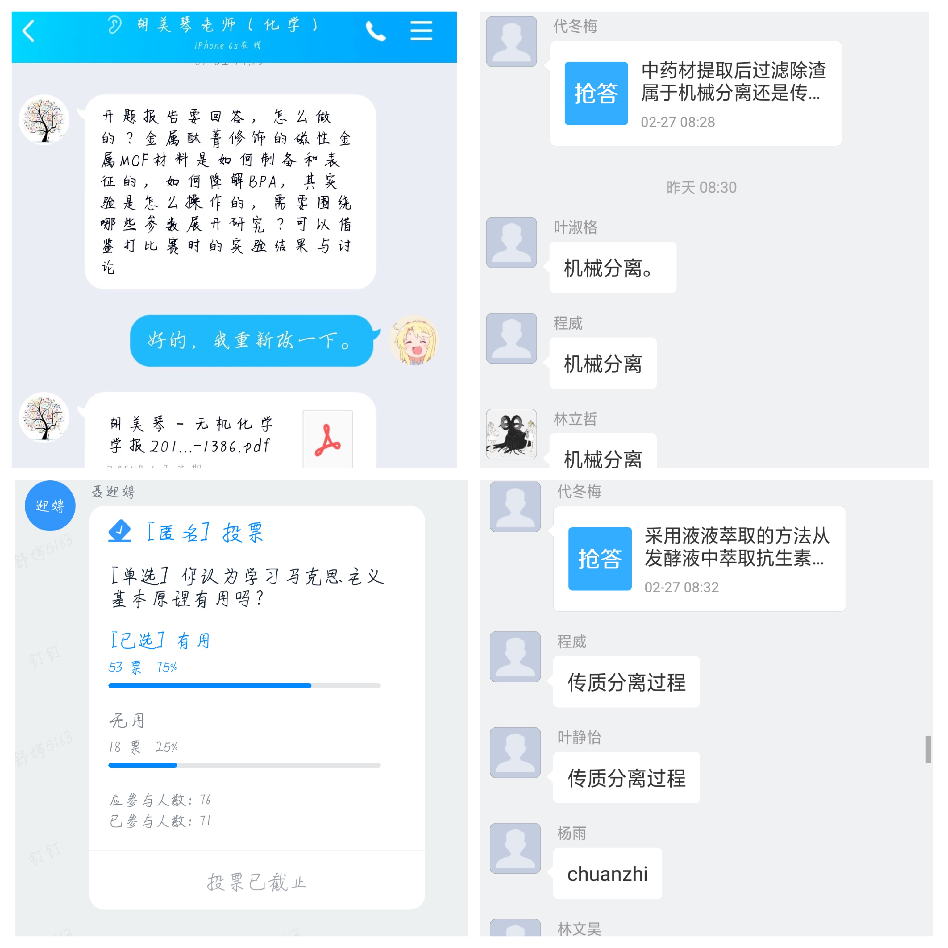 二胎妈妈代冬梅和陈佳这学期共同承担了包括《仪器分析》、《药剂学》、《药物分离技术》、《中药保健食品概论》多门课程,任务量大。宅家备课、线上讨论、多平台运行、录制网络课程每个环节两位老师都付出了大量的精力。新任妈妈冉诗雅承担《阻燃材料学》和《化妆品科学与护肤》两门课程的教学任务,每天都像上满发条一样,在紧张繁忙中度过。这些宝妈们的网课上得可一点也不含糊,课程讲解,习题解答,线上互动得到了同学们的纷纷点赞,工作养儿两不误,线上教学显身手。